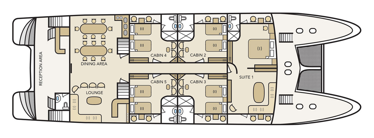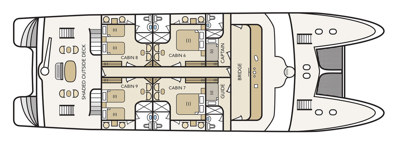 Kabinen: 1 Master Suite und 4 Twin Kabinen auf dem Hauptdeck, 2 Twin Kabinen und 2 Kabinen mit Doppelbetten auf dem Oberdeck. Alle Kabinen bieten einen fantastischen Blick aufs Meer und verfügen über ein eigenes Badezimmer, Balkon und Klimaanlage.