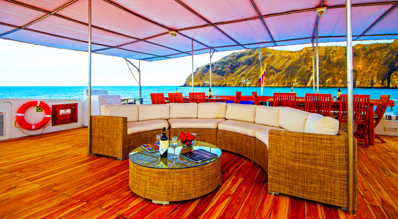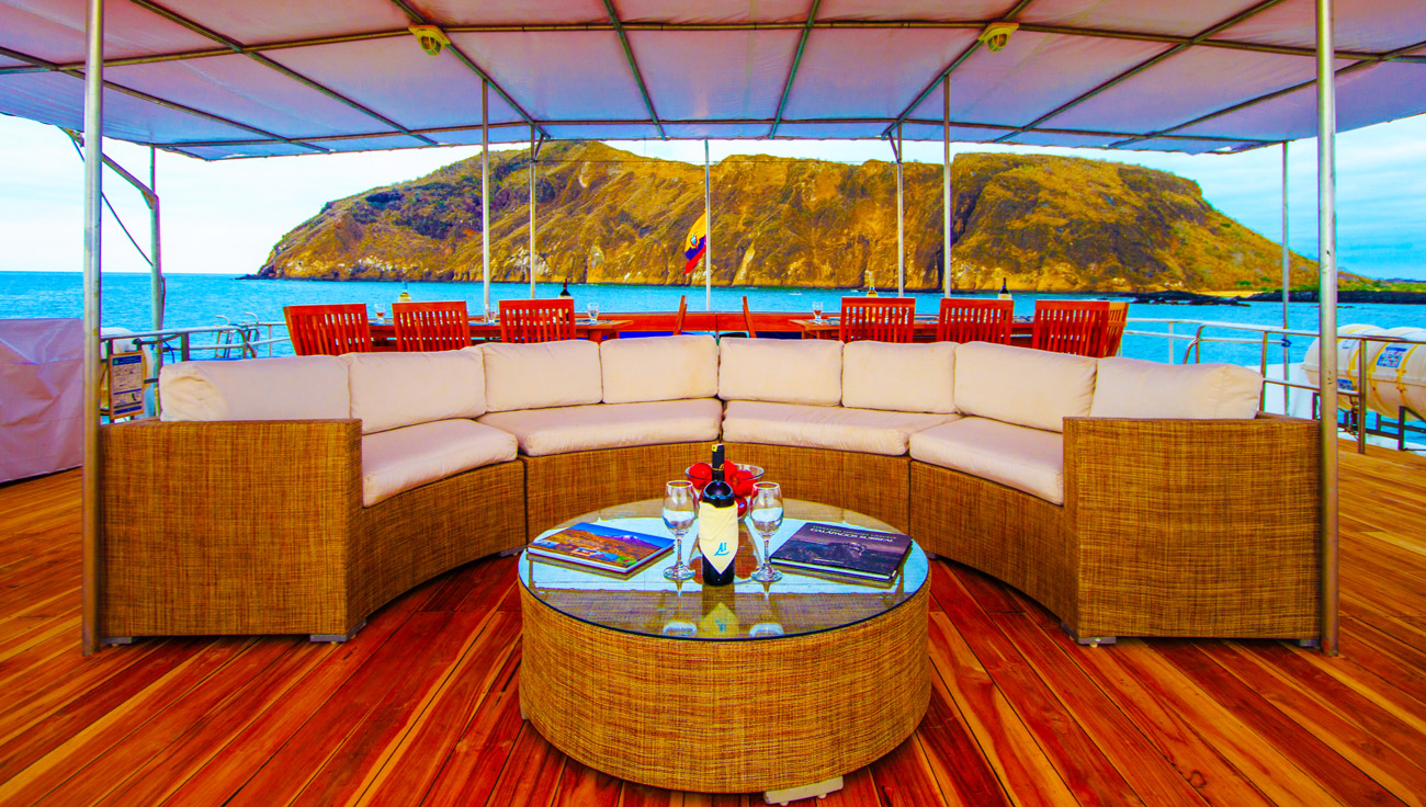 Am Vormittag werden wir durch den Bolivar Kanal zur Tagus Bucht fahren (Fahrzeit 3h). Sie können in Ruhe Ihr köstliches Mittagsbuffet genießen, bevor wir an der Tagus Bucht schnorcheln werden. Zahlreiche Ausbrüche haben Teile der Vulkane abgesplittert, welche nun das hufförmige Halbrund der Tagus Bucht bilden. Der innere Kraterrand umfasst den Darwin See. Früher war es Tradition, dass die Seemänner die Namen ihrer Schiffe an die Ost-Klippen der Tagus Bucht geschrieben haben. Während der Wanderung am Kraterkamm des Darwin Sees entlang, haben Sie einen tollen Ausblick auf den äußeren Einsturzkrater und den ausgestreckten Lavahang am Darwin Vulkan. Dieses dürre Inlandsgebiet ist überwuchert mit tropischer trockener Waldvegetation inklusive einer speziellen Vielfalt an heiligem Holz, Galapagos-Baumwolle und gelben Cordien. Während des Wanderns können Sie außerdem Darwinfinken, Fliegenschnäpper und Galapagosbussarde beobachten.