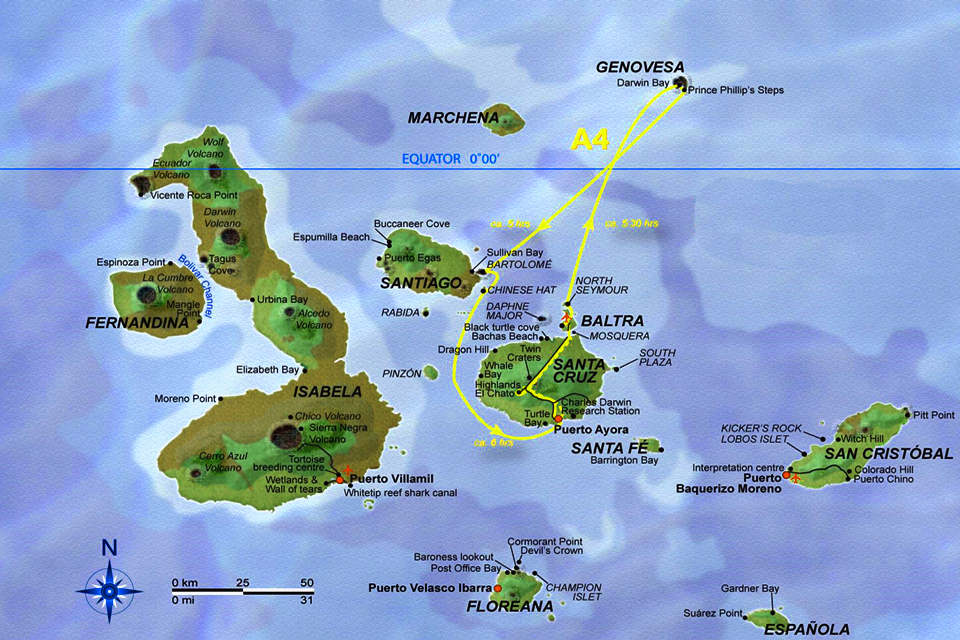 Nach dem Frühstück und einer nassen Landung an dem geschützten Strand von Darwin Bay, werden Sie einen geführten Spaziergang machen und schnorcheln gehen. Diese Seite zeigt ein extrem abwechslungsreiches Küsten-Ökosystem der Galapagos Inseln. Der Pfad startet vom Korallensandstrand und führt vorbei an einem Gebiet mit Salzbüschen und Mangroven, bevor Sie einen Gezeitenbach durchqueren und karge Lavaformationen und Buschlandschaften entdecken. Der Weg endet schlussendlich am Rande von einigen Klippen. Hier haben Sie die Chance Seelöwen, Reiher, Fregattvögel, Rotfußtölpel, Gold-Waldsänger, Dararwinsfinken und Galapagos Spottdrosseln kennenzulernen.