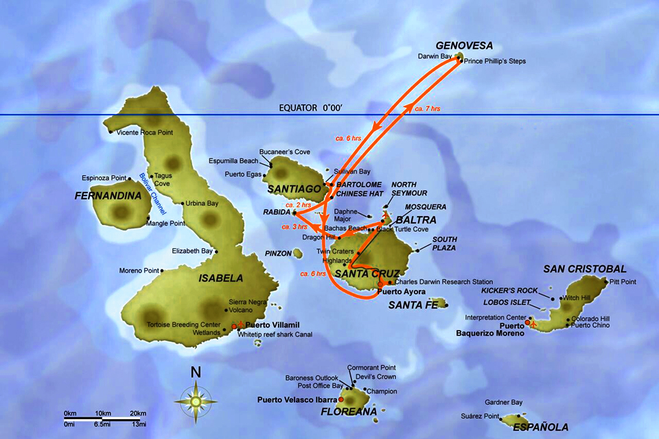 Nach dem Essen und einer nassen Landung an dem geschützten Strand von Darwin Bay, werden Sie einen geführten Spaziergang machen und schnorcheln gehen. Diese Seite zeigt ein extrem abwechslungsreiches Küsten-Ökosystem der Galapagos Inseln. Der Pfad startet vom Korallensandstrand und führt vorbei an einem Gebiet mit Salzbüschen und Mangroven, bevor Sie einen Gezeitenbach durchqueren und karge Lavaformationen und Buschlandschaften entdecken. Der Weg endet schlussendlich am Rande von einigen Klippen. Hier haben Sie die Chance Seelöwen, Reiher, Fregattvögel, Rotfußtölpel, Gold-Waldsänger, Dararwinsfinken und Galapagos Spottdrosseln kennenzulernen.