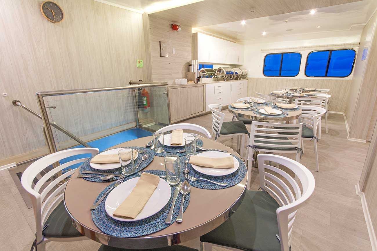 Nach dem Frühstück und einer nassen Landung am außergewöhnlichen roten Strand von Rabida sind zwei kleine geführte Wanderungen geplant. Oxidierte Eisenpartikel geben den Steinen und dem Sand ihre rostige Farbe. Die Strandwand hält grün gesäumte Lagunen bereit; diese Oase ist der fruchtbarste Ort auf der sonst trockenen Insel, welche überwachsen ist mit Palo Santo Bäumen. Der salzige Pool ist für alle Arten von Wasservögeln attraktiv, wie die Spiessente und manchmal die amerikanischen Flamingos. Zwischen dem immergrünen Blattwerk der umliegenden Mangrovebüschen brüten viele Arten von Singvögeln. Eine herausragende Attraktion ist die große Brutkolonie der braunen Pelikane, der einzigen Art, die stoßtaucht. Beim Rückweg werden Sie von Schlauchbooten abgeholt, wo Sie sich für ein weiteres Schnorchelabenteuer vorbereiten.